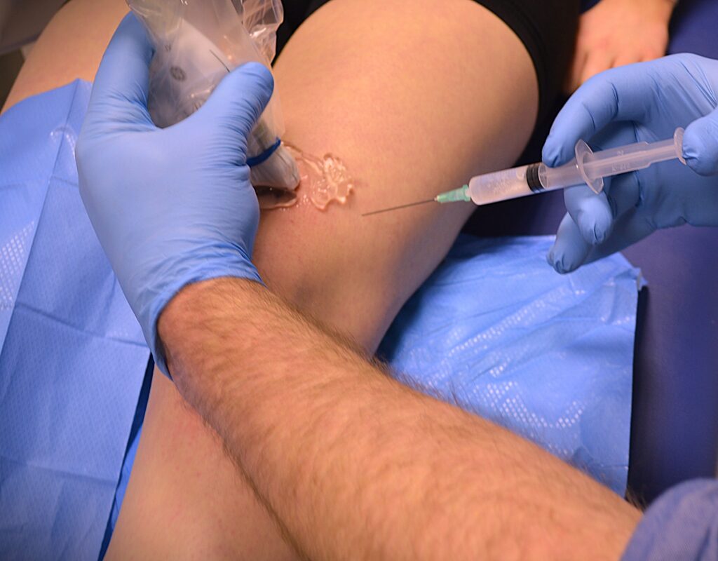 Joint and soft tissue injections can be really helpful in controlling and managing swelling and pain affecting a joint or soft tissue (bursa, nerve, tendon, ligament). These can be used in conjunction with rehabilitation and other treatments to help with movement, pain and restore the ability to exercise. Pain and swelling often limit the progression of rehabilitation and an injection of steroid (cortisone) combined with a local anaesthetic can remove that barrier and allow you to move pain free. This provides a helping hand in progressing with exercise.